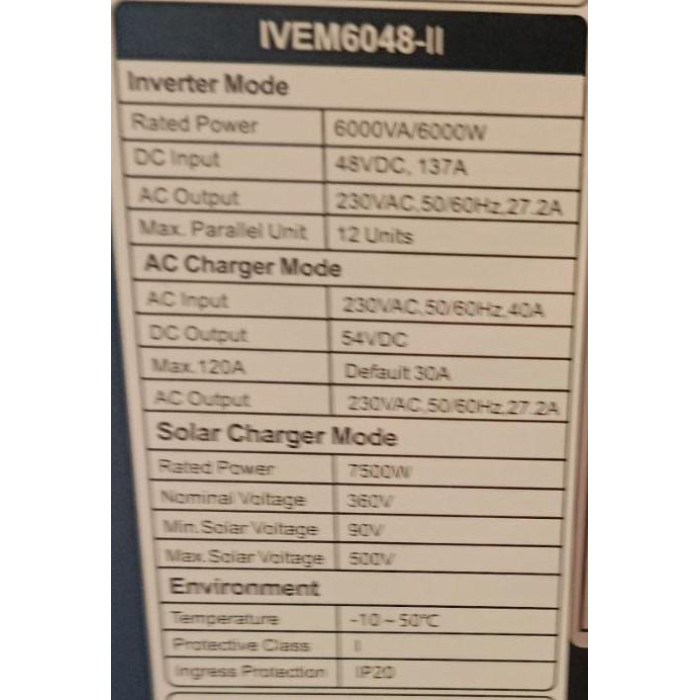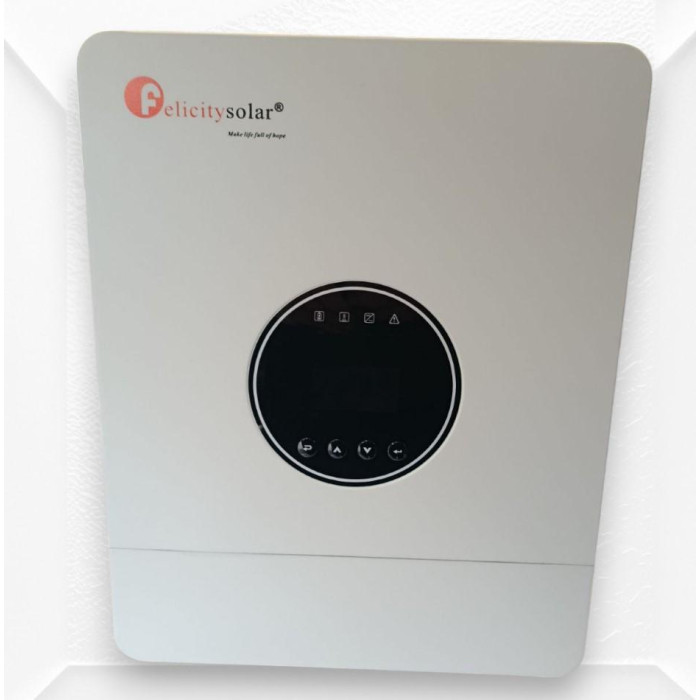Felicity IVEM6048-II — современный однофазный гибридный инвертор мощностью 6 кВт, предназначенный для построения автономных и гибридных энергосистем на базе солнечных панелей и аккумуляторов 48 В. Модель совмещает функции инвертора, MPPT-контроллера и зарядного устройства от сети/генератора, обеспечивая стабильное электропитание даже при отключениях.