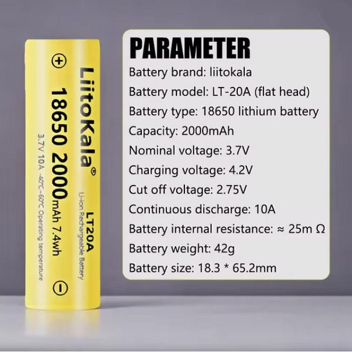 Характеристики для Акумулятор 18650, LiitoKala LT20A, 2000mAh, оптом