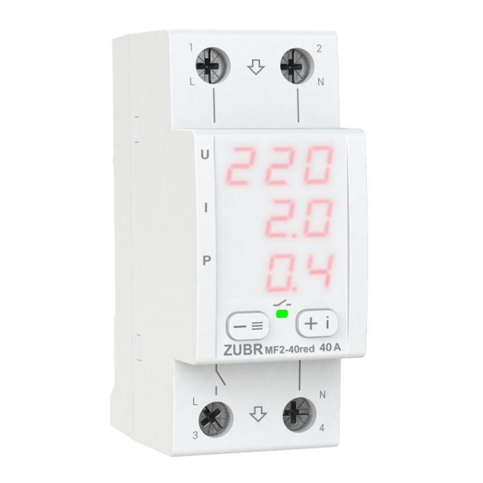 Описание к Многофункциональное реле однофазное MF2-40 на DIN-рейку, 40А, 8800ВА, 120-280В, двухмодульное с индикатором напряжения, тока, мощности (Красный)