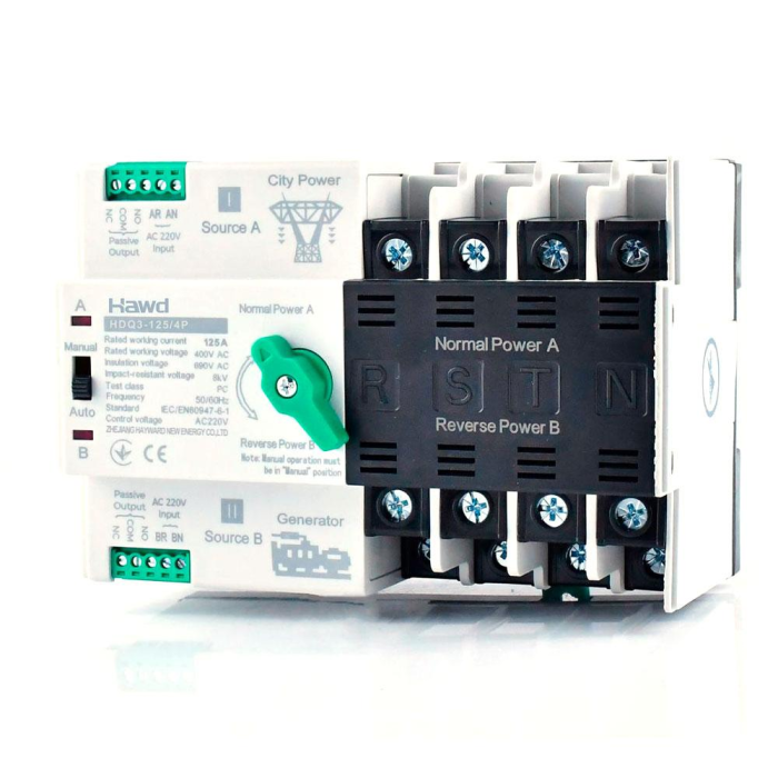 Автомат ввода резерва (АВР) четырехполюсный HDQ3-125E/4P, 400V/125A на DIN-рейку для генераторов