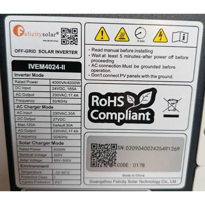 Описание к Гибридный инвертор Felicity IVEM4024-II 24V 4 кВт – чистая синусоида, MPPT контроллер, резервное и солнечное питание