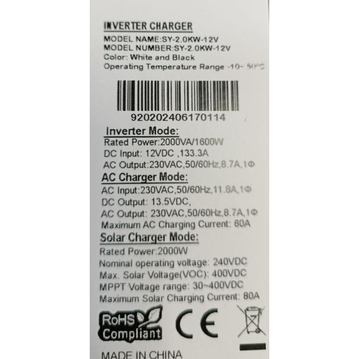 Характеристики для Комплект резервного живлення LiFePO4 1280 Wh + Інвертор SY-2.0K12 1600Вт 80A