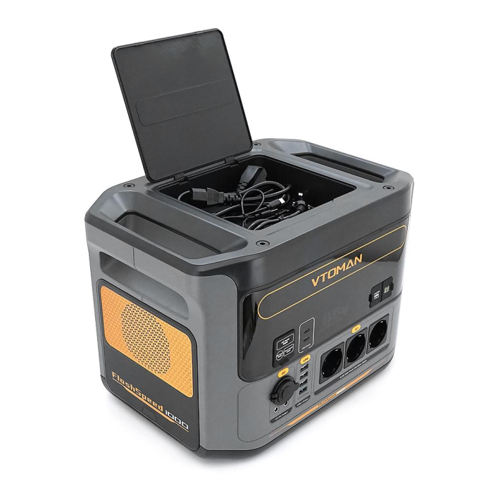 Портативна електростанція VTOMAN FLACHSPEED DE-FS1000-B 1000 Вт, з можливістю розширення до 2376 Вт·год: підключивши цю портативну електростанцію до додаткового акумулятора FlashSpeed 1500, ви зможете збільшити ємність з 828 Вт·2 забезпечить більш тривалий час роботи. (Повна зарядка з додатковим акумулятором займає приблизно 3–4 години.)